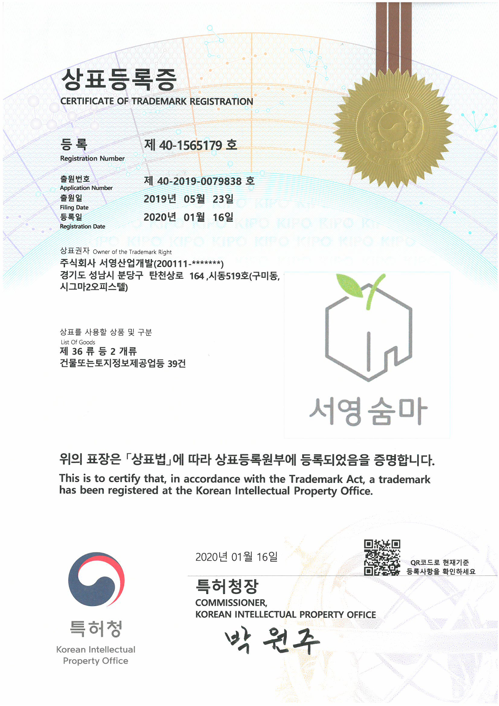 상표등록증 제40-1565179호 2020.01.16 특허청